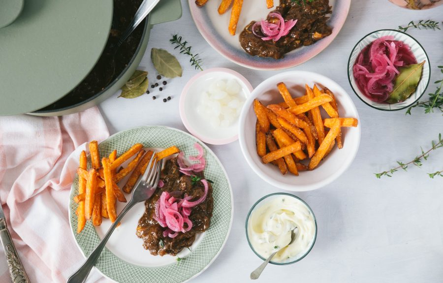 Een van de meest bekende en favoriete manier om bataat te eten is het maken van frietjes! Zoete aardappel friet is ontzettend lekker en snel gemaakt. Boen de aardappels goed schoon, dep ze droog en snijd in staafjes. Met schil worden ze bovendien nog wat knapperiger. Hussel om met olie, peper en zout en verdeel over een bakplaat. Bak in de oven op 220 graden in een half uurtje mooi bruin en hussel de frietjes halverwege goed om. Serveer de frietjes bij deze vegan kapsalon of stoofvlees, zoals zuurvlees van jackfruit met zoete aardappel frietjes.