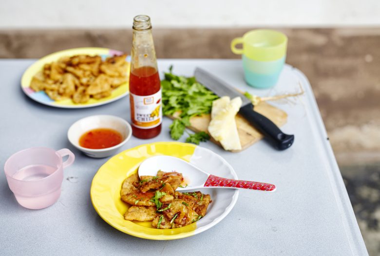 Nipalin zag eens iemand op tv ananas frituren en bedacht zelf dat het waarschijnlijk nog lekkerder zou zijn in een beslagje. Dat klopt! Serveer de ananas met onze chilisaus voor een pittige snack!