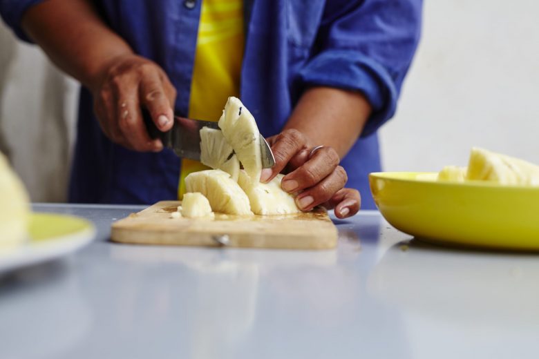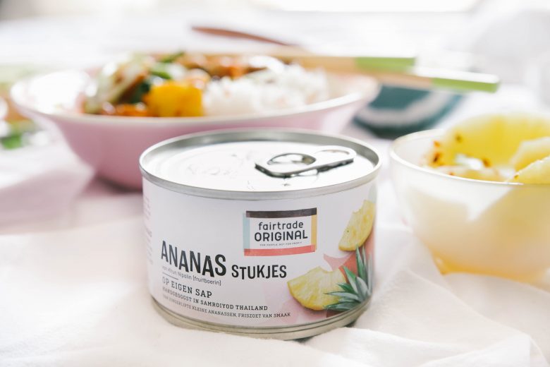 Rond het middaguur schijnt de zon op z’n felst op de ananasplanten van Khun Nipalin. Met haar kapmes oogst ze handig de rijpe exemplaren. Ook als ze klein zijn. Want die zijn minstens net zo zoet. Ze worden even verderop geschild, in stukjes gesneden en in een praktisch klein blikje gedaan. Met alleen het eigen sap. Daardoor blijft de pure smaak van jouw ananas bewaard.