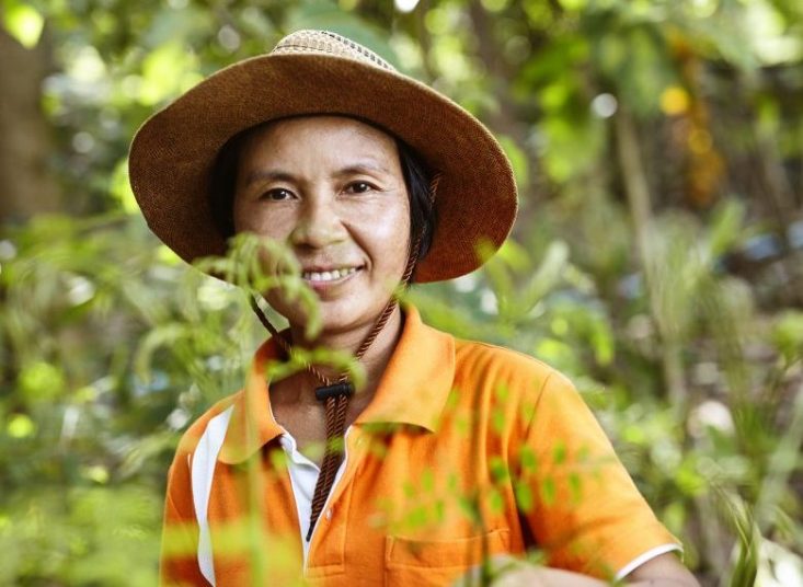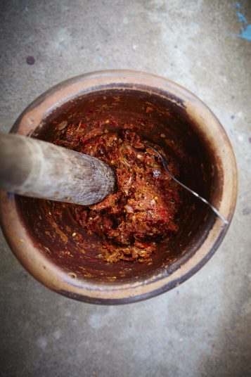 We lopen met onze kruidenboerin Khun Orachan door de tuin. Ze blijft steeds even staan om te kijken en te proeven van haar kruiden en specerijen. Haar sjalotjes, gember en citroengras geven deze Sambal Badjak zijn kruidige smaak.