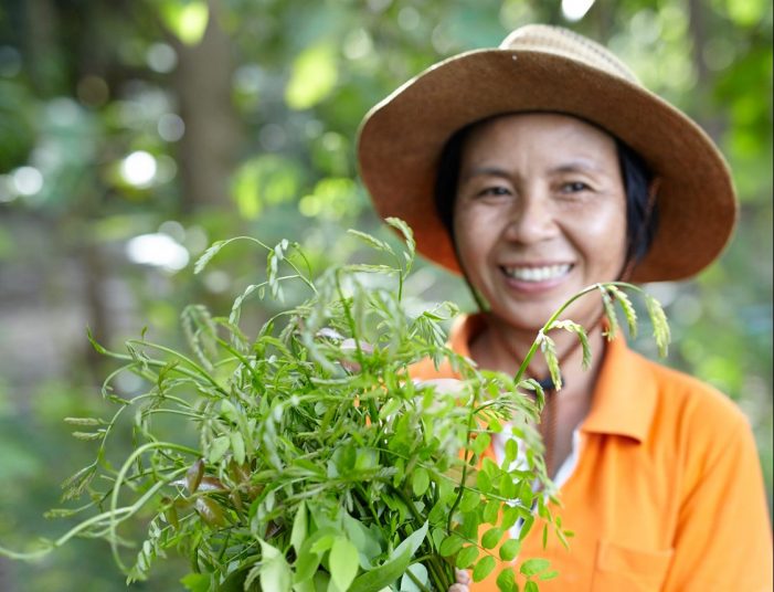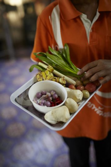 Kruidenboerin Khun Orachan neemt ons mee naar haar weelderige groene tuin. “Ruik eens”, zegt ze. En ze wijst naar stengels citroengras. Het frisse citrusaroma hangt als een geurige deken om ons heen. Het is de citroengras die deze romige Tom Kha soep zijn frisheid geeft.