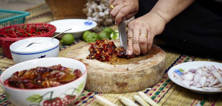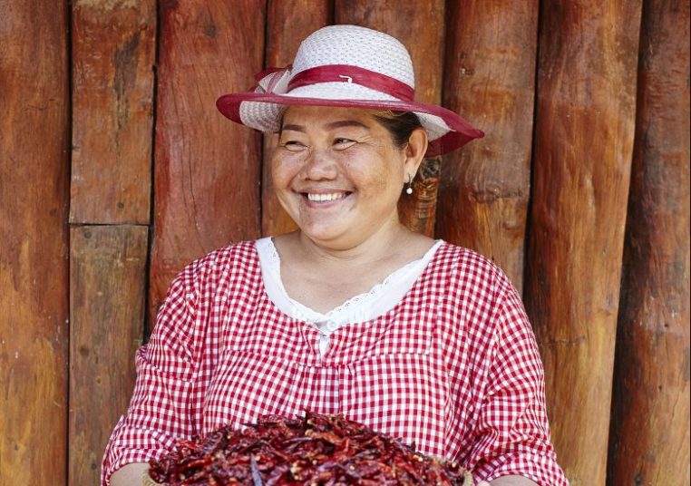 De zon staat al iets lager, maar de hitte is nog altijd intens. Khun Orapin plukt de rijpe, rode pepers. Ze zijn heter dan de groene, maar ze geven ook meer smaak aan deze curry.