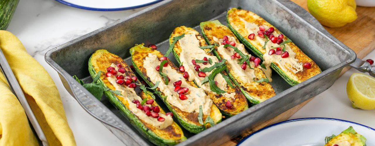 5. Verdeel de yoghurtsaus over de geroosterde courgette en bestrooi ze met granaatappelpitjes en wat achtergehouden gehakte munt.