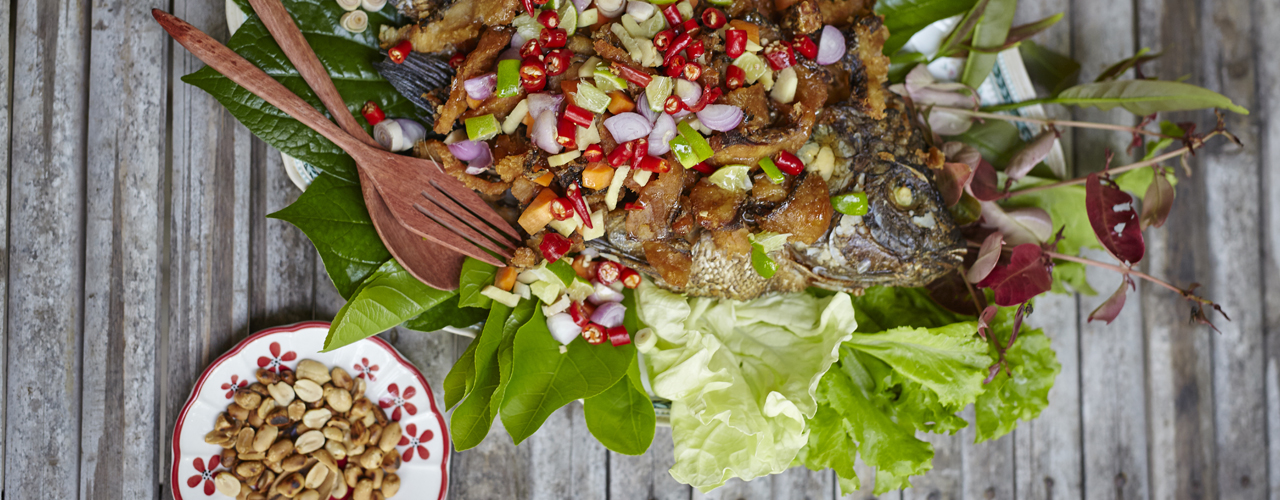In Thailand frituren ze de vis in zijn geheel, met een spectaculair eindresultaat. Moeilijk is het niet. De huid van de hele vis zorgt voor knapperigheid. Voor de salade plukt Orachan kruiden van haar land. Wij vervangen die door ons bekende slasoorten.