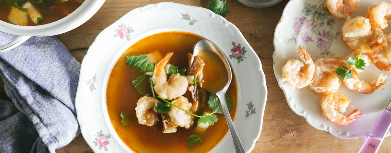 Zin in een pittige Thaise soep? Maak dan eens deze Tom Kha met een subtiele hint naar Tom Yum door het gebruik van garnalen door de soep. In de Thaise keuken combineren ze graag verschillende smaken en dat vind je ook terug in deze soep: pittig en zuur. Zin in een andere Thaise soep? Wat dacht je van deze Tom Kha Kai!