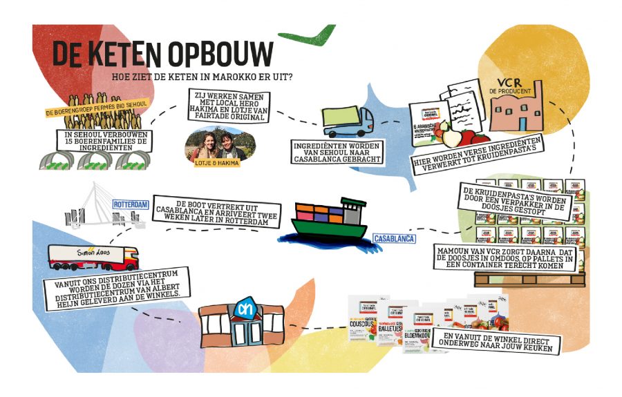 Vervolgens worden alle ingrediënten geoogst in Rabat en verwerkt en verpakt in Casablanca tot kruidenpasta’s. Daarna worden alle producten per boot naar Nederland verscheept, dat proces ziet er zo uit: