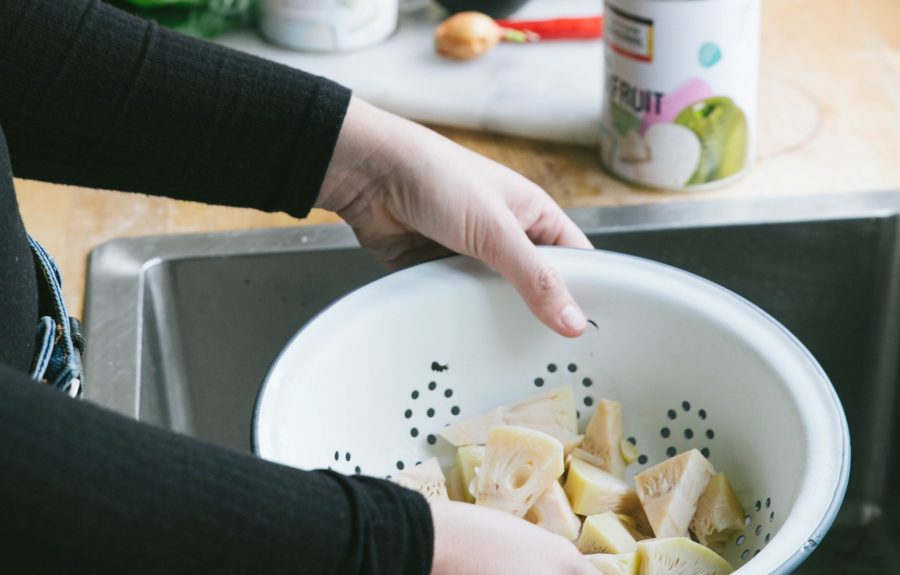 Open het blik en giet de inhoud in een vergiet zodat het vocht uit het blik loopt. Spoel vervolgens de stukjes jackfruit af met koud water net zoals bij kikkererwten en linzen.
